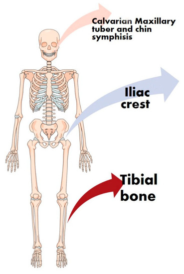 Autologous bone refers to bone tissue harvested from a site of the same patient. Autologous bone for orthopaedic and reconstruction of the facial bones is taken from the iliac crest, from tibial bone, the mandibular ramus, the chin symphysis and maxillary tuber (Figure 2) [21].