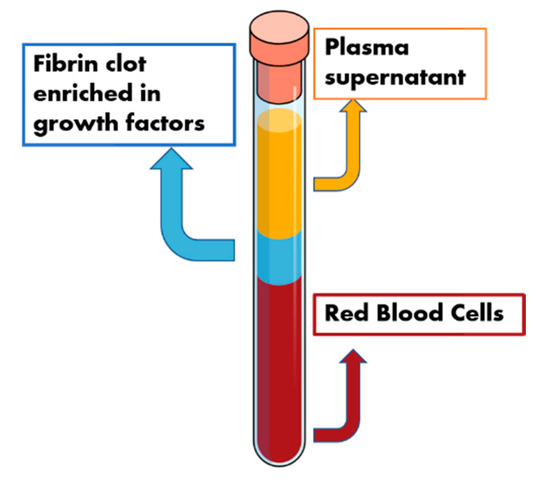 In the last few years, different kinds of protocols have been developed to obtain autologous platelet concentrates: the first one was platelet-rich plasma (PRP) and plasma rich in growth factors (PRGF) [26]. This first attempt to obtain a material rich in growth factors, however, presented several challenging factors in its preparation, limiting its use. Indeed, the protocol for the PRP production included the blood withdrawn by venipuncture in tubes with acid citrate dextrose, a first centrifugation, the transfer of the obtained supernatant into other tubes, a second centrifugation at higher speed, the removal of the obtained supernatant and the gentle resuspension of the plasma clot [27]. The preparation, therefore, was complicated and hardly reproducible.