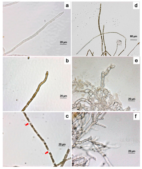 The effects of α-MG morphology of C. gloeosporioides in potato sucrose broth (PSB) for 24 h. Control hyphae (a); the hyphae treated with 500 μg·mL−1 α-MG (b–d); chemical control, 4.5 μg·mL−1 carbendazim (e) and 3.0 μg·mL−1 myclobutanil (f). Red arrows: intercellular cavity. Magnification: (a–c,e,f) 400×; (d) 200×. Bar: 20 μm.
