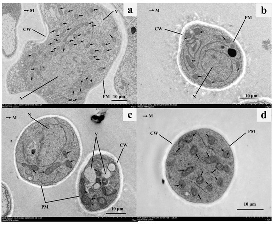 Transmission electron micrographs (TEM) of C. gloeosporioides treated with α-MG. The control mycelia plasma was homogenous, and the cell wall (CW), undulated plasmalemma (PM), and intracellular organelles, including the nucleus (N), mitochondria (M, black arrows), and vacuoles (V), unbroken and normal structures (a). Sections of C. gloeosporioides treated with 500 μg·mL−1 α-MG demonstrated tumefaction and decreasing mitochondria (b,c). C. gloeosporioides hypha exposed to 4.5 μg·mL−1 carbendazim showed disorganization of the hyphae nuclear membrane and nucleolus (d). Bars: 10 μm.