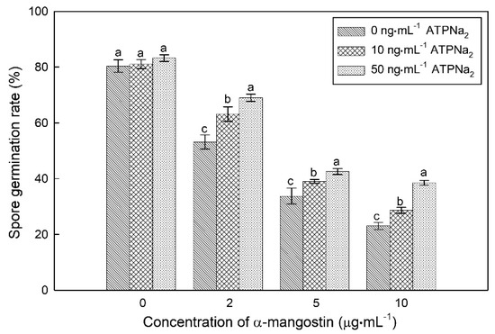 The inhibitory effect of α-mangostin in combination with ATPNa2 on conidia germination of C. gloeosporioides. Different letters on bars in the same column indicate significant differences (p < 0.05).