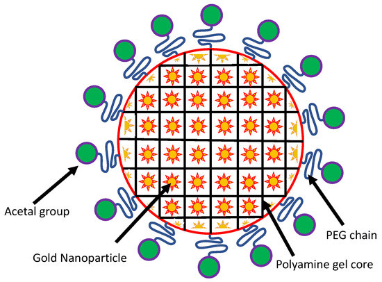 Schematic representation of the AuNP nanogel. The AuNPs are embedded in a core of polyamine gel, which are PEGylated with terminal acetal groups.