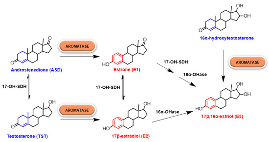 Estrogens, belonging to the family of steroid hormones, are synthesized starting from cholesterol, transported inside the mitochondria and converted into pregnenolone, the precursor of all steroid hormones, which is then exposed to an extensive metabolism by 17-hydroxilase/17,20-lyase enzyme to give androstenedione (ASD). ASD is then converted into the two most common estrogens in the body, estrone (E1) and estradiol (E2), by the action of two enzymes: 17β-hydroxysteroid dehydrogenase and aromatase (CYP19A1). In particular the latter, belonging to the superfamily of cytochromes P450, converts ASD into E1 and testosterone (TST) into E2 (Figure 1) [3,4].