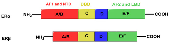 Estrogens exert their wide physiological functions by binding to estrogen receptors (ERs), nuclear transcription factors that regulate the mechanism of many physiological functions in humans. ERs exist in two main isoforms, ERα and ERβ, showing high homology, composed of different functional regions: N-terminus domain (NTD), DNA binding domain (DBD) and ligand-binding domain (LBD) (Figure 2).