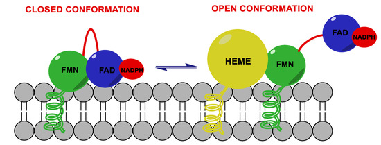 HA performs its function thanks to the electrons supplied by NADPH-cytochrome P450 reductase (CPR), a transmembrane protein formed by two cofactor domains: the flavin adenine dinucleotide (FAD) domain, which also contains the NADPH binding site, and the flavin mononucleotide (FMN) domain (Figure 3). In addition, a linker domain is situated between the FMN and FAD/NADPH domains. The transfer of electrons is considered to occur from NADPH to FAD and then to FMN. It was observed that CPR can take a “closed” conformation, where the FMN domain is close to FAD/NADPH domain favoring the internal transfer of electrons, or an “open” conformation, where the two cofactor domains are far away. The latter conformation seems to facilitate the intermolecular transfer of electrons from FMN to monooxygenase. The electronic activity of CPR is therefore regulated by the interconversion from the closed to the open conformation [15,16,17].