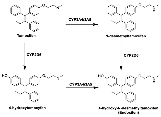 TAM is in fact a prodrug, and within the body it undergoes extensive metabolism by different cytochromes P450 that convert it into three active metabolites (Figure 4): 4-hydroxytamoxifen, N-desmethyltamoxifen and 4-hydroxydesmethyltamoxifen (endoxifen, END). The anticancer effect of TAM is thus mainly due to the activity of these metabolites, in particular 4-hydroxytamoxifen and END, produced by hydroxylation and demethylation of the drug by the action of hepatic CYP3A4/3A5 and CYP2D6 [31]. Despite its therapeutic advantages, the use of TAM is limited by the development of intrinsic or acquired drug resistance [32] and its notable side effects, mostly in a long term therapy, among which the increased risk of developing endometrial cancer, caused by its agonist effect in the uterine tissue. This risk is dose- and time-dependent, and several studies have shown that patients taking TAM have two to three times greater risk of developing endometrial cancer than the rest of the population [33].