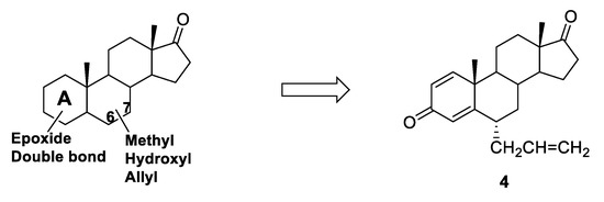 Another study evaluating the effect of substitutions in positions 6 and 7 of the steroid core was performed by Roleira et al. [57]. Starting from the hit compounds identified in their previous works [58,59,60] (in which a double bond or epoxide functions were inserted in different positions of ring A), new series of compounds were synthesized (Figure 8) carrying methyl, hydroxyl or allyl groups at C6 or C7 positions of the steroid backbone. C6-substituted compounds generally showed a higher HA inhibitory activity with respect to the corresponding C7 derivatives, and docking analysis showed that the substituent in position 6 was able to better fit into the access channel of HA, and thus to better interact with the enzyme, with respect to the same substituent on C7. From this study, compound 4 (Figure 8) emerged as a potent irreversible AI, showing an IC50 (55 nM) in the same range of exemestane.