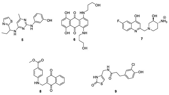 A proof-of-principle study of the feasibility of allosteric modulation of HA was performed in 2019 by Magistrato and coworkers [61]. With the aim to exploit a new therapeutic approach that could reduce side effects and delay the development of acquired resistance of the therapeutic strategies currently in use, an integrated computational and experimental protocol was developed to identify commercially available small molecules able to inhibit HA in a non-competitive or mixed way. Given the recent discovery of the mixed/non-competitive inhibition mechanism of LTZ [54], they initially performed docking of this inhibitor on the two putative allosteric sites investigated in their previous work [52]. It was seen that, by binding to Site 1, LTZ was able to displace the network of water molecules crucial for HA activity as source of protons for its catalytic activity. The same behavior was observed for E-END, which could thus hamper proton delivery. Both LTZ and END could also firmly bind into Site 2, the heme proximal cavity indicated to stabilize the interaction between HA and CPR. Then, a virtual screening of different ligand libraries was performed, followed by MD simulation and calculation of the binding free energy (ΔGb) that allowed a subsequent refinement in the number of hits. The best molecules were then tested in preliminary inhibitory assays and five molecules (5–9, Figure 9) showed HA inhibition activity in the µM range. Compounds 5, 6 and 7 were identified by virtual screening performed on Site 1, while compounds 8 and 9 on Site 2. The antiproliferative activity of these compounds and LTZ on MCF-7 (ER+) and MDA-MB-231 (ER–) cell lines was also evaluated. Except for 7, the other molecules were able to reduce the growth of MCF-7 cells, while only compounds 6 and 8 showed some antiproliferative activity on ER– cells. Finally, enzymatic kinetics assays confirmed a non-competitive or mixed mechanism of action for the selected compounds.