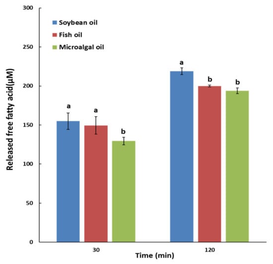The degree of oil hydrolysis was expressed in terms of the released free fatty acid (FFA) content (µM) via a step-by-step in vitro simulation of the digestion process with saliva, gastric, duodenal, and bile juices, lasting 30 and 120 min (Figure 1). The released FFA content at 30 min was significantly higher in soybean oil and fish oil than in microalgal oil, and that at 120 min was significantly higher in soybean oil than in fish oil and microalgal oil (p < 0.05).