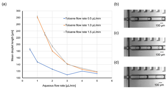 Given that scaling effects are important in chemical reactions involving microdroplets, control over droplet size is desirable. Therefore, the influence of the flow rates of the two phases on droplet size was investigated using toluene as a representative example. Figure 4a shows the variation of the mean toluene droplet length under different flow rates of the dispersed phase (toluene; 0.5, 1.0, or 1.5 µL/min) and continuous phase (water containing 4 wt % Tween 20; 0.5, 1.0, 1.5, 2.0, 3.0, 4.0, or 5.0 µL/min). The mean droplet length ranged from 110 to just over 280 µm. As shown in the plot, the mean droplet length decreased with increasing flow rate of the aqueous phase. The flow rate of the organic phase had the opposite effect on the droplet length, with an increased flow rate affording larger droplets. Uniform droplet generation was also confirmed, especially for high total flow rates (i.e., the sum of the flow rates of the aqueous and organic phases); the standard deviation of the droplet length ranged from 10% at low total flow rates to 1% at high total flow rates. However, the variation of the mean droplet length was irregular when the toluene flow rate was 1.5 µL/min, which was ascribed to facile wetting of the device surface by toluene and inhibited droplet formation when the toluene flow rate was too high. Figure 4b–d presents images of toluene droplets in the cross-junction area for various aqueous flow rates and a fixed toluene flow rate. It can be clearly seen that the flow rate of the continuous phase affected the toluene droplet length. These results indicate that the toluene droplet length could be manually controlled by adjusting the flow rates of the organic and aqueous phases.