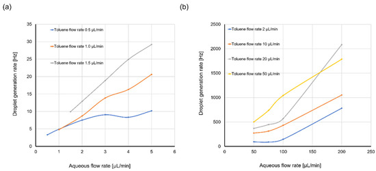 Variation in toluene droplet generation rate under different flow rates of dispersed phase (toluene) and continuous phase (water containing 4 wt % Tween 20). (a) The toluene flow rate was 0.5, 1.0, or 1.5 µL/min, and the aqueous flow rate was 0.5, 1.0, 1.5, 2.0, 3.0, 4.0, or 5.0 µL/min. (b) The toluene flow rate was 2, 10, 20, or 50 µL/min, and the aqueous flow rate was 50, 75, 100, or 200 µL/min.