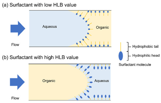 Interface of the aqueous and organic phases at the droplet generation area when using the surfactant with (a) a low HLB value and (b) a high HLB value.