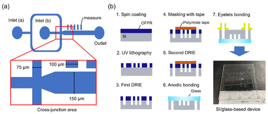 The device fabrication process is presented in Figure 7b. The devices were fabricated via lithography and dry-etching techniques. First, a silicon wafer with a thickness of 525 µm and soda–lime glass with a thickness of 500 µm were cut to obtain square substrates (30 × 30 mm2). Positive photoresist (OFPR-800LB, 200cp; Tokyo Ohka Kogyo, Tokyo, Japan) was spin-coated onto the silicon substrate and the channel design was patterned onto the resist via ultraviolet lithography (MA/BA6; SUSS MicroTec, Garching, Germany). The silicon substrate with the patterned resist was dry-etched via deep reactive ion etching (RIE-400iPB; Samco, Kyoto, Japan) to fabricate the channels. After the first etching step, the channel was partially covered with polyimide tape to restrict the etching area prior to a second cycle of etching to form the through holes. After completion of the etching processes, the resist was removed and the glass substrate was bonded to the silicon substrate by anodic bonding to seal the channels. Finally, eyelets were glued onto the substrate to provide the inlets and outlet.