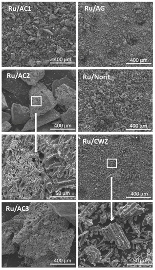 The morphology of carbon supports and ruthenium catalysts was assessed with the use of scanning electron microscope (SEM) FEI Quanta 250 FEG equipped with EDS (Energy Dispersive Spectrometer) system (Hillsboro, OR, USA).