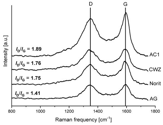 All spectra show two characteristic bands at around 1355 and 1590 cm−1. The band at higher frequency called the G band is attributed to plane vibrations of sp2-bonded carbon atoms of the ordered structure with a high degree of symmetry. In turn, the band at lower frequency described as the D band is characteristic for the defected and disordered structure of carbon materials [39,40,41]. The ID/IG ratio was calculated for each sample, and the results are included in Figure 2 and Figure 3 [42]. Differences in the contribution of disordered and ordered phases were observed in the case of the structure of bare carbon materials, and final catalysts were evidenced. The ID/IG ratio for supports decreases in the following order: AC1 > CWZ ≈ Norit > AG (from 1.89 for AC1 to 1.41 for AG, respectively). It means that the structure of the AC1 has the largest number of defects in contrast to the AG sample in which the contribution of disordered phase in the structure is the lowest. An impregnation of carbon materials by ruthenium slightly changes the content of both phases in the structure of catalysts. The ID/IG ratio of the Ru/AC1, Ru/CWZ, and Ru/Norit catalyst is lower in comparison to bare supports. This suggests that the introduction of Ru increases the contribution of the ordered phase in the structure of carbon materials [43]. On the contrary, in the case of Ru/AG, there are no significant changes in the ID/IG ratio of the support and catalyst.
