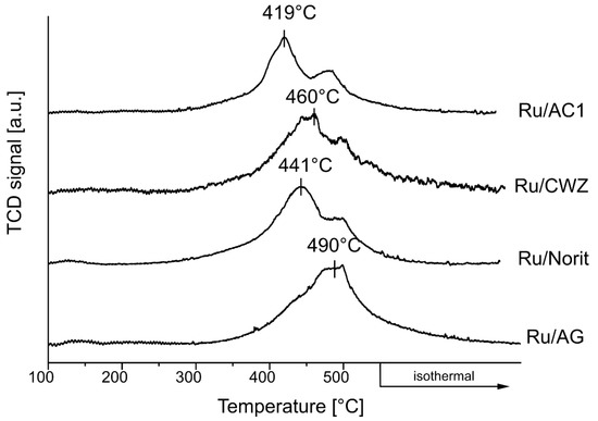 The hydrogen consumption at high temperature above 400 °C is attributed to the reduction of support near ruthenium crystallites. It can be also observed in the TPR-H2 profiles of bare supports, but it started at higher temperatures than in the case of catalysts. Metal on carbon materials catalyzes the gasification of the carbon materials probably due to the higher hydrogen activity on the surface of the metal crystallites [59].