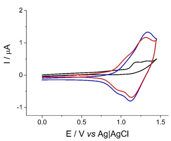 The chiral oligomer film was electrodeposited onto a polycrystalline gold disk surface, starting from the enantiopure (S)-BT2T4 monomer and using a protocol analogous to those reported in detail elsewhere [8,10,11,12]. In brief, repeated oxidative potential cycling at 0.2 V s−1 was performed over the potential region 0–1.4 V vs. Ag/AgCl (KCl, saturated), in a CH3CN solution containing 0.5 mM (S)-BT2T4 and 0.1 M TBAPF6, as supporting electrolyte. The first and fortieth cycles are displayed in Figure 1 (with black and red line, respectively).