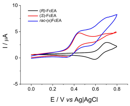 The enantio-recognition ability of the oligomer-modified gold electrode (oligo-(S)-BT2T4-Au) was assessed by CV in acetonitrile solutions containing the chiral probes (S)-(−), (R)-(+) and racemate rac-(±) of N,N-dimethyl-1-ferrocenylethylamine (FcEA) ((S)-FcEA, (R)-FcEA and rac-(±)FcEA, respectively), as shown in Figure 2. For comparison, the CVs of the same probes were performed using the bare Au-disk electrode (Figure S2).