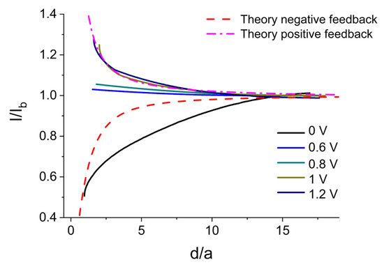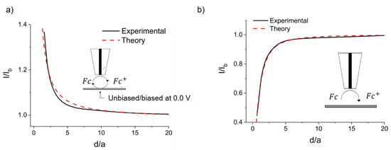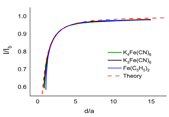 where n is the number of electrons, F is the Faraday constant, D is the diffusion coefficient of the electroactive species (in this case 7.0 × 10−6 cm2s−1 [32]), cb is the bulk concentration and a is the radius of the microdisk. The RG parameter was evaluated by fitting fitting experimental approach curves recorded under purely diffusion-controlled conditions to the theoretical curves [33,34]. The RG thus estimated varied between 5 and 8.