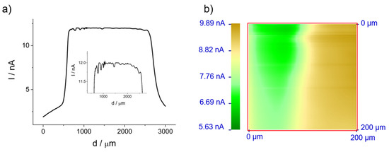 One-dimensional (a) and bi-dimensional (b) scans obtained by using Fc as redox mediator and a Pt microdisk with 12.5 µm radius. The tip was positioned at 10 µm above the substrate.