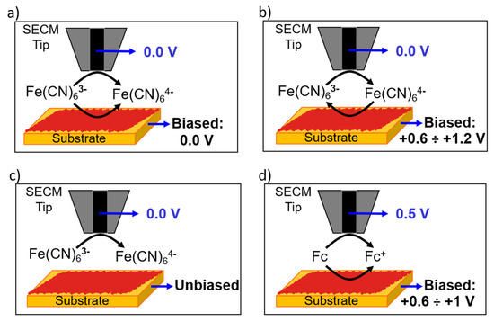 Schemes of the redox processes occurring at the microelectrode tip and substrate at different potentials applied at the substrate. (a–c) and (d) refer to Fe(CN)63− and Fc redox mediator, respectively. Potential applied to the tip and substrate as indicated in the figure.