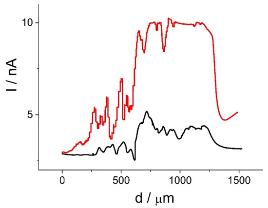 One-dimensional scans recorded in a 2 mM K3Fe(CN)6 + 0.1 M KCl water solution with the microelectrode tip located at 10 µm above the oligo-(S)-BT2T4-Au. Microelectrode tip biased at 0.0 V substrate unbiased (black line) and biased at 1 V (red line).