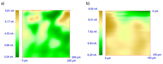 The I vs. d profile in Figure 8 with the black line and the image in Figure 9a, both characterized by relatively low currents, reflect, essentially, the topography of the material; the current spikes in Figure 8 are conceivably due to the surface roughness (including defects in the film), which as mentioned above, seems to be rather high. The scan displayed with the red line in Figure 8 and the image in Figure 9b, characterized by larger currents, reflect both activity (i.e., conductivity) and topography of the oligo-(S)-BT2T4 film. The current spikes, again, are due to the rather rough topography of the investigated material. An estimate of the roughness of the oligo-(S)-BT2T4 film was made by the analysis of the current oscillations of the 1D scans, using the same approach employed above for the bare Au surface. Ra and Rmax values were 2.1 and 4.1 µm, respectively, indicating a higher roughness with respect to the bare Au surface, as also appears from SEM images shown in Figure S1.