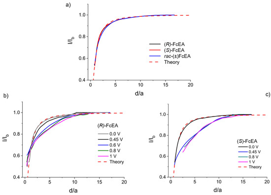 Apparently, the results obtained by using the enantiomers of the chiral redox mediator are qualitatively similar to those described above for Fc. This is not surprising as, at the microelectrode tip, they share as expected the same E1/2 value (within experimental error, see Figure S3 and Table S1) and, as discussed above, the oligomer film behaved as an insulating porous membrane when it was in its uncharged form. Thus, at the unbiased substrate, negative feedback currents were recorded, regardless of the configuration of the chiral redox mediator (Figure 10a). Similarly, when the substrate was biased at 0.0 V, negative feedback currents were obtained (black lines in Figure 10b,c), due to both the limited active substrate area below the microelectrode tip and the relatively high d/a at which the microelectrode could be brought above the substrate (see above discussion). At higher applied potentials, the typical I/Ib vs. d/a responses for competitive oxidation of the redox mediators at both microelectrode tip and substrate occurred (blue, green and magenta lines in Figure 10b,c). However, in these cases, a careful analysis of the SECM responses allowed verifying that the decrease of I/Ib, at same d/a, was larger for (S)-FcEA with respect to (R)-FcEA, indicating a clear discriminating ability of the oligo-(S)-BT2T4 film towards the two probe enantiomers. For instance, when the substrate was biased at 0.45 V, at which only (S)-FcEA could be oxidized (Figure 2), I/Ib were about 0.65 and 0.77, at d/a = 2 and 4, respectively; the corresponding values (i.e., at same d/a) for (R)-FcEA were 0.78 and 0.92, respectively. As the substrate potential was shifted further towards more positive values (i.e., 1 V), the oxidation of both (S)-FcEA and (R)-FcEA was under diffusion control, and I/Ib vs. d/a acquired very close profiles.