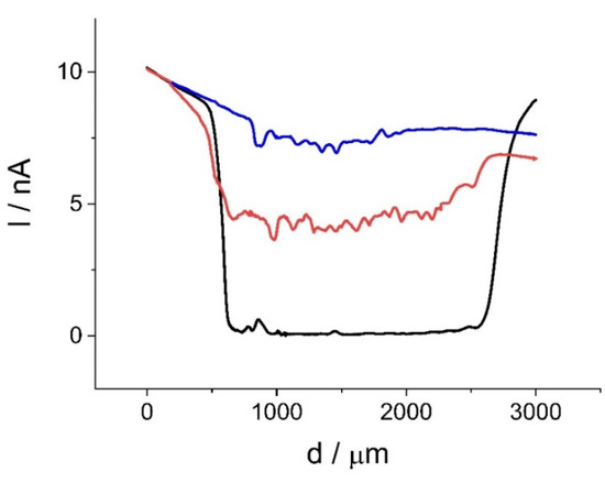 To further support the above view, 1D scans were performed above the oligo-(S)-BT2T4-Au substrate using rac-(±)FcEA, as redox mediator (Figure 11). The microelectrode tip was biased at 0.55 V, while the substrate was either unbiased (blue line) or biased at 0.45 V (red line) and 1 V (black line). Again, the scans were started from the insulating portion of the substrate and the microtip moved towards the entire section of oligo-(S)-BT2T4-Au. At the unbiased substrate, current spikes, conceivably due to the substrate topography (see above discussion), were recorded. When the substrate was biased at 0.45 V only (S)-FcEA could be oxidized (Figure 2) and the current decreased to a significant extent, due to the consumption of the probe at the underlying gold surface. The current decrease was much more marked when the substrate was biased at 1 V, at which both (S)-FcEA and (R)-FcEA could be oxidized. These results therefore confirm the enantiodiscrimination ability of the oligo-(S)-BT2T4 film and that the phenomenon occurred, essentially, evenly across the entire substrate surface.