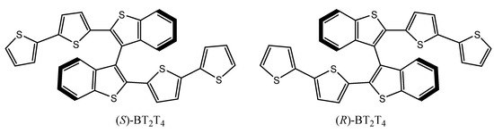 Conducting polymers (CPs) or oligomers consist of repeating units of conjugated electroactive organic molecules and display high chemical stability and conductivity [1]. They can mediate reactions while in their conductive state, making them viable as electrode materials. In addition, CPs are widely used as electrode modifiers to fine-tune the performance and quality of a variety of substrates [2]. In this regard, considerable attention has been devoted to the preparation of CP-modified electrodes to be employed as chemo- and bio-sensors to enhance sensitivity and selectivity in electroanalytical applications [2,3,4]. Among other desired sensing properties, enantiomer discrimination and quantification are fundamental for chiral compounds of interest in pharmaceutical, food, fragrance and environmental fields. Chirality is often introduced into CPs by attaching chiral pendants to the monomers to be (electro)oligomerized to yield the CP conjugated backbone [5], but other alternative approaches have also been proposed [6]. Outstanding chirality properties have been recently observed with electroactive films electrosynthesized from “inherently chiral” electroactive monomers, designed so that chirality and electroactivity originate from the same element, coinciding with the main molecular backbone featuring a tailored torsion on account of an atropisomeric or helical building block with associated high racemization barrier; this results in powerful chirality manifestations, possibly also electrochemically modulated [6]. The so far best studied example of inherently chiral monomer is 2,2′-bis(2,2′-bithiophene-5-yl)-3,3′-bibenzothiophene (BT2T4) (Scheme 1), featuring a 3,3′-bibenzothiophene atropisomeric core (with sterically hindered rotation between its two halves); its C2 symmetry results in propagation and amplification of its outstanding chirality properties in macro- and supramolecular structures [7].
