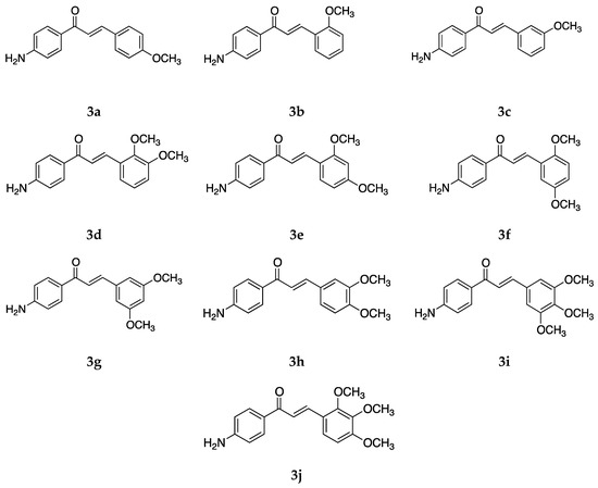 Apart from the cytotoxic activities of methoxy-substituted 4-aminochalcomes, the antimicrobial activity of 3a–f has also been tested by Suwito et al. [40] against Escherichia coli ATCC 25923, Staphylococcus aureus ATCC 259, and Candida albicans ATCC 10231 using different concentrations of the compounds, similar to 1. All of the compounds showed promising antibacterial activity, especially 3d, which showed the strongest inhibition activity against Escherichia coli ATCC 25923 (diameter of inhibition = 10.68 ± 0.16 mm at 500 µg/mL), Staphylococcus aureus ATCC 259 (diameter of inhibition = 10.33 ± 0.01 mm at 500 µg/mL), and Candida albicans ATCC 10231 (diameter of inhibition = 11.30 ± 0.15 mm at 500 µg/mL). The activity of compound 3d was comparable to the positive controls sulfamerazine and sulfadiazine.
