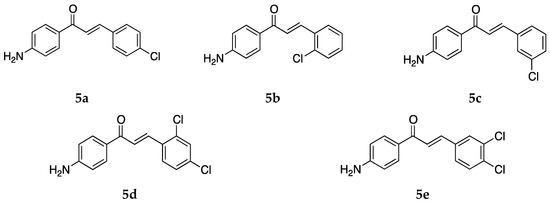 Several 4-aminochalcones with halogen substitutions, particularly chloro-, fluoro-, and bromo- on ring B have also been reported by various research groups over the years. The 4-aminochalcones with various chlorine substitutions have been reported by four research groups and are shown in Figure 7. The anticancer activity reported for 5a–e by various research groups is shown in Table 5.