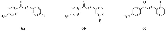 The anticancer activity of the three mono fluoro derivatives was reported by Santos et al. [39] against estrogen-receptor-positive breast cancer cells MCF-7 and the triple-negative breast cancer (TNBC) cells MDA-MB-231. Compound 6a did not show any significant activity, and the IC50 values were not determined. The IC50 values for 6b were >100 and 74.1 ± 1.2 µM for MCF-7 and MDA-MB-231 cancer cells, respectively. Compound 6c was the more potent against these cells among all of the compounds tested with IC50 values 13.2 ± 3.5 and 34.7 ± 5.2 µM, respectively. Compound 6c induced apoptosis rather than necrosis in both cells. The 3-chloro-4-aminochalcone compound 5c was also very active against the MCF-7 cell line. A comparison among values for the different compounds tested showed that more electronegative halogens on ring B showed a higher degree of antiproliferative activity against the MCF-7 and MDA-MB-231 cancer cell lines. Electron-donating groups, on the other hand, had a negative effect on bioactivity, as can be seen from the values of compounds 2 and 3a.
