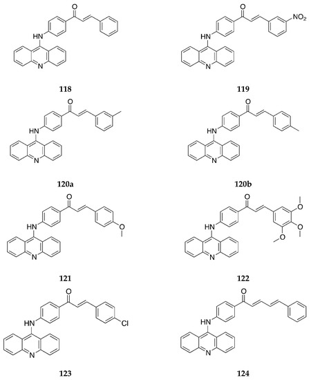 - Tomar, V.; Bhattacharjee, G.; Kamaluddin, N.; Rajakumar, S.; Srivastava, K.; Puri, S. Synthesis of new chalcone derivatives containing acridinyl moiety with potential antimalarial activity. Eur. J. Med. Chem. 2010, 45, 745–751. [Google Scholar] [CrossRef]