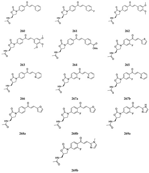 - Selvakumar, N.; Kumar, G.S.; Azhagan, A.M.; Rajulu, G.G.; Sharma, S.; Kumar, M.S.; Das, J.; Iqbal, J.; Trehan, S. Synthesis, SAR and antibacterial studies on novel chalcone oxazolidinone hybrids. Eur. J. Med. Chem. 2007, 42, 538–543. [Google Scholar] [CrossRef]