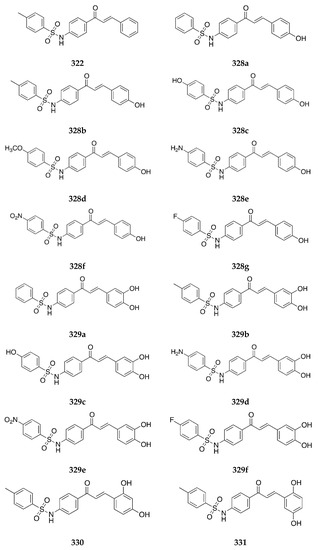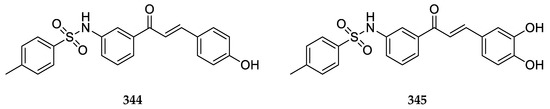 Seo et al. [47] tested compounds 344 and 345 for glycosidase inhibitory activity against α-glucosidase, α-amylase, and β-amylase. The α-glucosidase activities (IC50 values) of 344 and 345 were 12.4 µM and 15.6 µM, respectively. IC50 values of 344 against α-amylase and β-amylase were 37.3 µM and 201.4 µM, respectively, and that of 345 against α- and β-amylase were 16.8 µM and 24.8 µM, respectively. These results suggested that the activities of compounds 344 and 345 were stronger against all three enzymes, with 345 being the more potent against α- and β-amylases than others. Both 344 and 345 exhibited weaker inhibition than 328b against α-glucosidase. This means that position 3 on ring A for the sulfonamide group is more favorable only for inhibition of α- and β-amylases. Overall, the activity of compounds 344 and 345 was much better than other chalcone derivatives assessed [47].