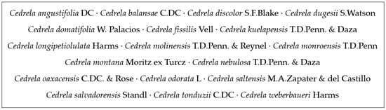 The genus Cedrela P. Browne contains 18 species (Figure 1) and is one of 53 genera of trees and shrubs from the Meliaceae family. These species are distributed from northern Mexico to the northwest part of Argentina [1,2,3].