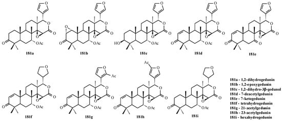 Based on assays with these structurally modified compounds, it proved possible to identify three systems in the chemical structure, which could be associated with the activity of compound 181: α,β-unsaturated ketone moiety in ring A, 7-acetate of ring B, and the furan ring.
