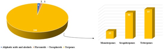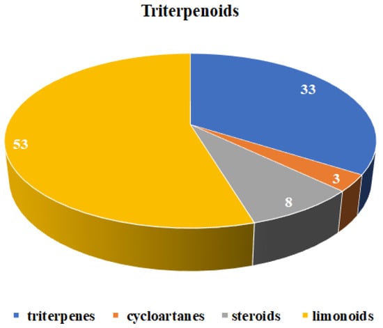 Triterpenes, one of the largest classes of natural plant products, are initially formed from squalene, following complex enzymatic reactions [40]. However, in addition to the need for specific enzymes for cyclization, it also depends on the conformation of squalene, yielding mainly oleanane, ursane, lupane, and dammarane carbon skeletons [41]. Triterpenes have a range of biological effects and are used in the prevention and treatment of some diseases [42]. The triterpenes (119–151) identified in the genus Cedrela are shown in Table 6.