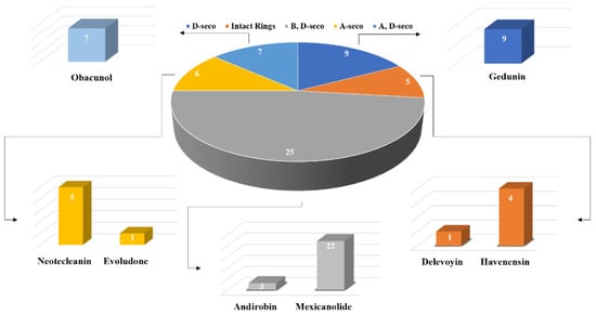 Limonoids are divided into ten classes, including fifteen types based on different seco- styles, carbon-chain styles, and ring types [16]. This classification was presented by Fang et al. [16], who sought to identify the class and type of limonoids isolated from the Cedrela species. Table 10 shows the analysis performed with 55 chemical structures of limonoids isolated from different Cedrela species found in this review, showing the different seco-styles and carbon frameworks of these limonoid types.