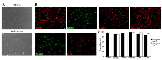 iAstrocytes were generated from induced pluripotent stem cells (iPSC)-derived neural precursor cells (iNPCs) as previously described [16]. iNPC differentiation induced cell size increase and typical morphology of astroglia (Figure 1A). As described [16,17], both iNPC and iAstrocytes expressed typical markers as GFAP, S100ß, nestin, vimentin and GLAST as detected by immunofluorescence experiments (Figure 1B,C and Figure S1). Astrocytes displayed strong expression of Interleukin 1 receptor (IL1R; Figure 1B,C), an inflammatory receptor upregulated under neuroinflammation [4], indicating that our in vitro human cell model could be responsive to inflammatory mediators.