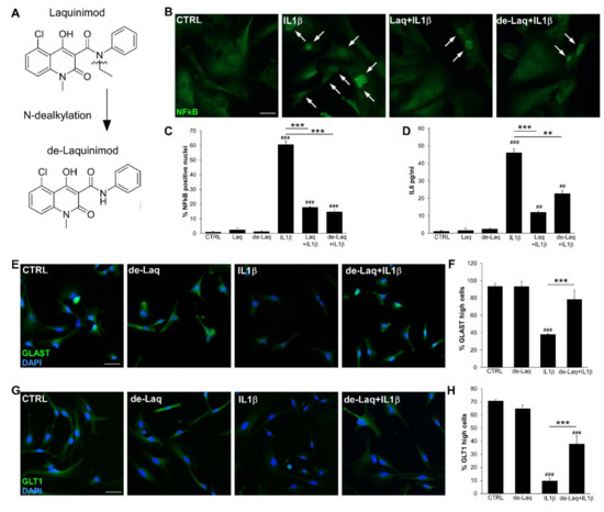 Nuclear factor kappa B (NFκB) is a key transcription factor in cytokine signaling, and astroglial NFκB drives the amplification of inflammatory and neurodegenerative processes [2,18,19]. To address the effect of Laq and de-Laq (Figure 2A) on astrocyte activation, we verified the impact of drug treatment on nuclear translocation of NFκB. As shown in Figure 2B, several nuclei were positive for NFκB when cells were stimulated with the inflammatory cytokine IL1β (CTRL vs. IL1β p < 0.001). On the contrary, when astrocytes were previously exposed for 4 h to Laq or de-Laq, IL1β-induced NFκB nuclear translocation was blocked (Figure 2B,C; IL1β vs. Laq + IL1β or de-Laq + IL1β p < 0.001).