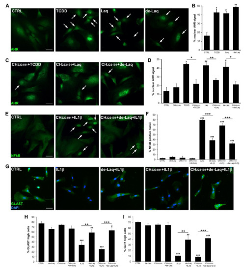 In vivo studies indicate that Laq action may be mediated by activation of the aryl hydrocarbon receptor (AHR) signaling pathway [24]. AHR is a ligand-activated transcription factor critical for responses to environmental stimuli including toxic chemicals like 2,3,7,8-tetrachlorodibenzo-p-dioxin (TCDD) [25]. To verify whether Laq activated directly AHR signaling in astrocytes, we assessed nuclear translocation of AHR in response to the drugs, or TCDD as a positive control, by immunofluorescence. Under resting conditions, few iAstrocytes displayed nuclear AHR expression (Figure 3A), however exposure to Laq or de-Laq significantly increased AHR nuclear signal (Figure 3A,B; CTRL vs. Laq p = 0.0032; CTRL vs. de-Laq p = 0.0108). CH223191, a dioxin ligand-selective antagonist of AHR [26], inhibited AHR nuclear translocation induced by TCDD and, most importantly, by Laq and de-Laq, demonstrating the specific effect of the drugs on AHR function (Figure 3C,D; Laq vs. CH223191 + Laq p = 0.0077; de-Laq vs. CH223191 + de-Laq p = 0.0226). To verify whether drug action on astrocyte function depended on AHR signaling, we repeated NFκB and glutamate transporter assays in human iAstrocytes after exposure to CH223191. As shown in Figure 3E,F, de-Laq blocked IL1β-induced NFkB translocation even in AHR-defective cells (CH223191 + IL1β vs. CH223191 + de-Laq + IL1β p < 0.001). Similarly, AHR inhibition via CH223191 did not dampen de-Laq capability to prevent GLAST and GLT1 downregulation in IL1β-treated astrocytes (Figure 3G–I; CH223191 + IL1β vs. CH223191 + de-Laq+ IL1β p < 0.001). Overall, these experiments indicate that Laq compounds modulate glial function independently from the activation of AHR.