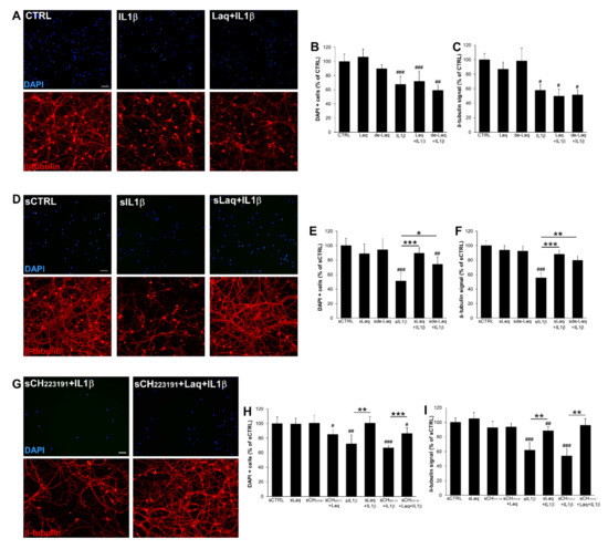 To address whether the drugs protect neurons from inflammation-induced neurodegeneration, rat spinal neurons were exposed to IL1β in the presence or absence of the compounds and assessed for cell number and morphology via DAPI and β-tubulin stainings. As previously shown [5], IL1β strongly reduced the number of neurons in culture and affected neuronal network integrity (Figure 4A; CTRL vs. IL1β: % DAPI positive cells p < 0.001, β-tubulin signal p = 0.04). Similarly, exposure of neurons to the drugs did not protect cells from IL1β-induced fragmentation of the neuronal network and death (Figure 4A–C). To study the effects of Laq and de-Laq on astrocyte–neuron interactions, in a second set of experiments we exposed human iAstrocytes to the compounds and then to IL1β for 8 h, changed the medium to remove stimuli, and collected the supernatants after a further 24 h culture. Astrocyte-conditioned media were then offered to spinal neurons. While supernatants from control cultures (sCTRL) did not affect network integrity and neuronal survival, conditioned media from human iAstrocytes exposed to IL1β triggered robust degenerative responses (Figure 4D–F; sCTRL vs. sIL1β: % DAPI positive cells and β-tubulin signal p < 0.001). However, when astrocyte media were generated in the presence of Laq (Figure 4E; sIL1β vs. sLaq + IL1β: % DAPI positive cells and β-tubulin signal p < 0.001) or de-Laq (Figure 4F; sIL1β vs. sde-Laq + IL1β: % DAPI positive cells p = 0.0123 and β-tubulin signal p = 0.0012), their addition to spinal neurons did not trigger neurodegeneration despite astrocyte exposure to IL1β. Moreover, blockade of AHR signaling in astrocytes via CH223191 did not reduce the neuroprotective action mediated by the drugs in glia cells as astrocyte media from Laq-treated cells did not result in being toxic to neurons (Figure 4G–I), thus confirming that AHR activation is dispensable for the modulation of the astrocyte response to inflammation by Laq.