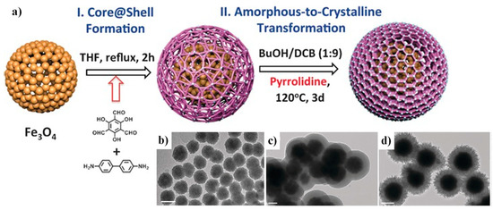 - Rodríguez-San-Miguel, D.; Yazdi, A.; Guillerm, V.; Pérez-Carvajal, J.; Puntes, V.; Maspoch, D.; Zamora, F. Confining Functional Nanoparticles into Colloidal Imine-Based COF Spheres by a Sequential Encapsulation–Crystallization Method. Chem. Eur. J. 2017, 23, 8623–8627. [Google Scholar] [CrossRef] [PubMed]