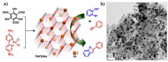 - Bhadra, M.; Sasmal, H.S.; Basu, A.; Midya, S.P.; Kandambeth, S.; Pachfule, P.; Balaraman, E.; Banerjee, R. Predesigned Metal-Anchored Building Block for in Situ Generation of Pd Nanoparticles in Porous Covalent Organic Framework: Application in Heterogeneous Tandem Catalysis. ACS Appl. Mater. Interfaces 2017, 9, 13785–13792. [Google Scholar] [CrossRef]
