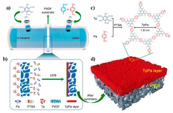 - Wang, R.; Shi, X.; Zhang, Z.; Xiao, A.; Sun, S.P.; Cui, Z.; Wang, Y. Unidirectional diffusion synthesis of covalent organic frameworks (COFs) on polymeric substrates for dye separation. J. Membr. Sci. 2019, 586, 274–280. [Google Scholar] [CrossRef]