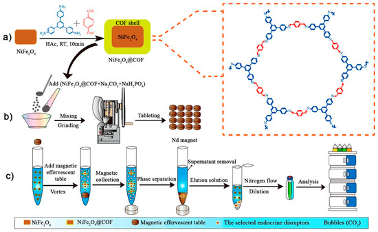 - Tan, C.; Li, J.; Liu, W.; Zhao, Q.; Wang, X.; Li, Y. Core-shell magnetic covalent organic framework nanocomposites as an adsorbent for effervescent reaction-enhanced microextraction of endocrine disruptors in liquid matrices. Chem. Eng. J. 2020, 396, 125191. [Google Scholar] [CrossRef]