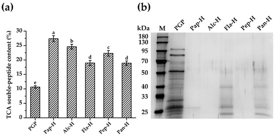To verify the effectiveness of protease hydrolysis, the TCA-soluble peptide content in P. geesteranus protein (PGP) and P. geesteranus protein hydrolysates (PGPHs) was investigated. As shown in Figure 1a, the yield of the TCA-soluble peptide was dramatically increased after being hydrolyzed by the five enzymes for 2 h and papain hydrolysate showed the highest content (27.38%; p < 0.05), followed by alcalase hydrolysate (24.61%), pepsin hydrolysate (22.31%), flavourzyme hydrolysate (18.97%), and pancreatin hydrolysate (18.93%), respectively. Furthermore, the molecular weight distribution of polypeptides in PGP and PGPHs were analyzed. As shown in Figure 1b, the non-hydrolyzed PGP mainly consisted of bands ranging from 20–120 kDa. Within this range, there were at least five major protein bands at around 27 kDa, 30 kDa, 55 kDa, 88 kDa, and 115 kDa, respectively. After hydrolysis, the major protein bands of alcalase and pepsin hydrolysates completely disappeared. Meanwhile, the major protein bands of PGP were effectively hydrolyzed by papain, flavourzyme, and pancreatin, except for the protein bands with the molecular weight of 27 kDa and 40 kDa as evidenced by the reduction in their intensity. The difference of TCA-soluble peptide content and protein bands in PGPHs may be associated with the cleavage patterns [25] and specificities of the enzyme used [26]. Overall, the enhanced TCA-soluble peptide content and the diminished protein bands suggested that papain, alcalase, flavourzyme, pepsin, and pancreatin could efficiently hydrolyze PGP.