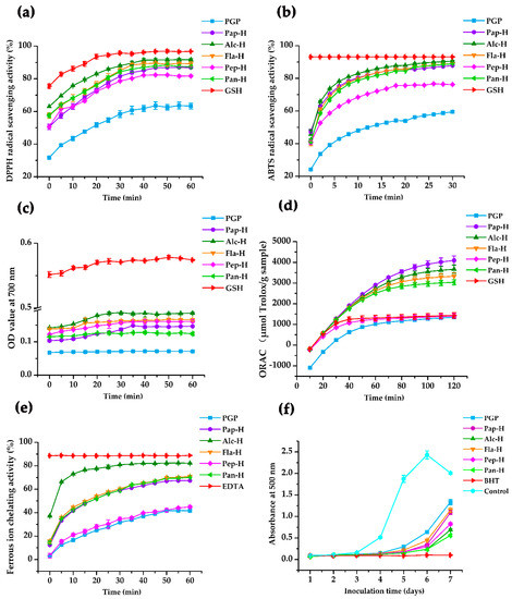 The lipid peroxidation inhibition capacity of PGP and PGPHs was measured in a linoleic acid emulsion system according to the method of Zhao et al. [57]. Samples (0.625 mL) were added in 10 mL of 50 mM phosphate buffer (pH 7.0) and then mixed with 0.13 mL of linoleic acid and 10 mL of 99.5% ethanol. The total volume was then adjusted to 25 mL with deionized water to obtain a final 0.1 mg/mL sample concentration. The mixture was incubated in at 40 ± 1 °C for seven days in dark. The degree of oxidation of linoleic acid was evaluated at 24 h intervals by measuring the ferric thiocyanate value. The reaction mixture (100 μL) was mixed with 4.7 mL of 75% ethanol, 0.1 mL of 30% ammonium thiocyanate, and 0.1 mL of 20 mM ferrous chloride solution in 3.5% HCl. After 3 min incubation, the growing color, which represents the linoleic acid oxidation, was measured at 500 nm. BHT and deionized water instead of samples were used as positive and blank controls, respectively.